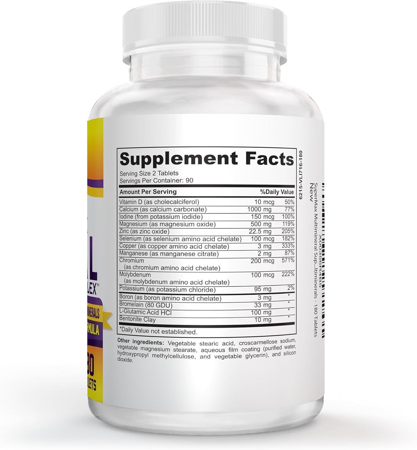 SUPER-MAX (ALL-IN-1) MULTI MINERAL SUPPLEMENT 3-MONTH SUPPLY – This mineral complex is one of the most comprehensive multi mineral supplements available providing 15 total minerals & nutrients including Bentonite Clay which in itself contains all 72 naturally occurring trace minerals – Unlike other brands, our multi-mineral supplement contains 180 tablets which is enough for 90 days (buying in bulk saves you money)