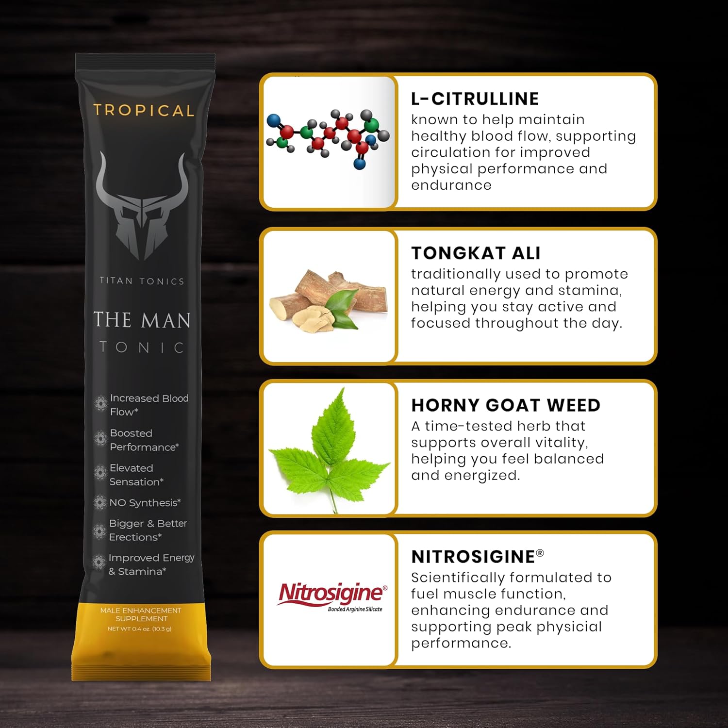 The Man Tonic is a decent men’s performance supplement that worked well for me. It was not a significant increase in performance for me, but was good. It has many good ingredients in this mix with high levels of Citruline and Nitrosignine. I have found that these two work for me, but I do find that others work a little better for me. The other ingredients make this a good combination supplement. Some of the others I find need to be higher levels for me.The tropical taste was good. I like the packets that are easy to use by tearing open and mixing with water. I’m sure this convenience adds to the cost. I find that I can get some of these ingredients in other supplements at higher levels for a little less cost.Overall, this is a good product and works well for me. But I do like to increase some of the ingredients to improve the effectiveness for me.
