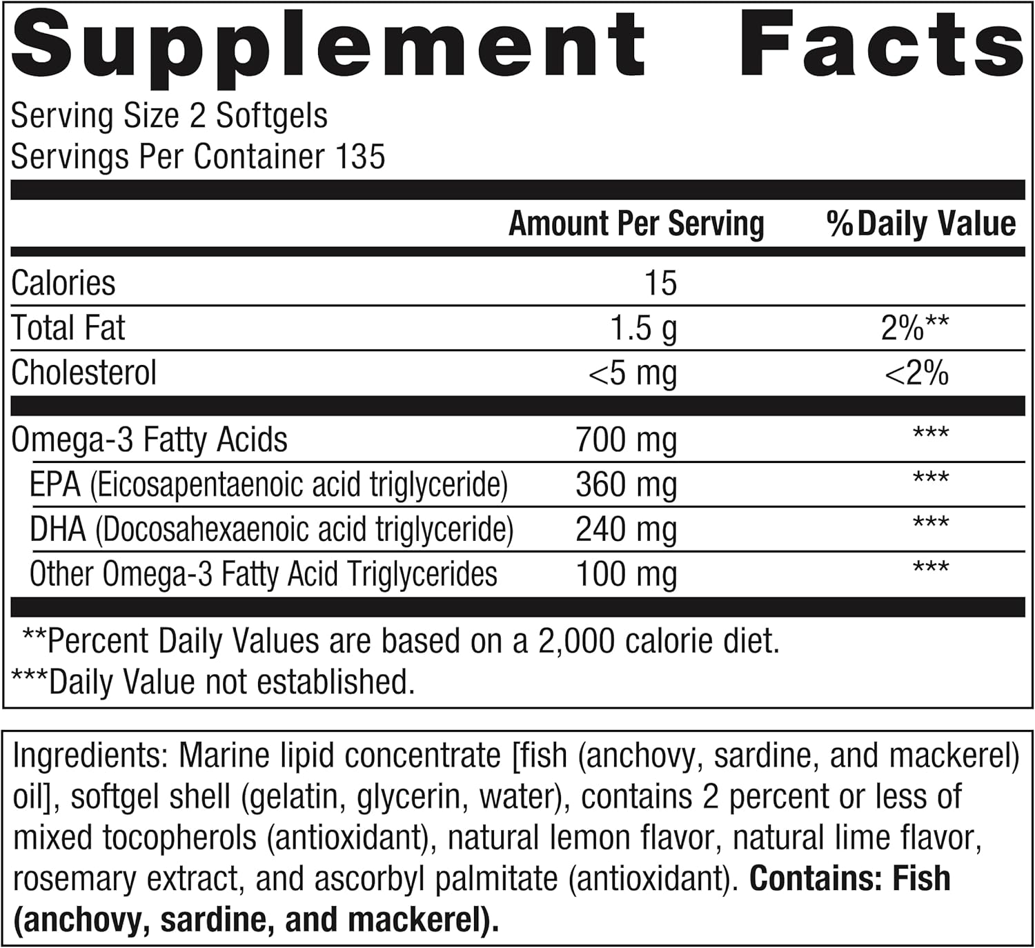 Each OmegaGenics Fish Oil EPA-DHA 300mg softgel provides a total of 180 mg EPA and 120 mg DHA in triglyceride form