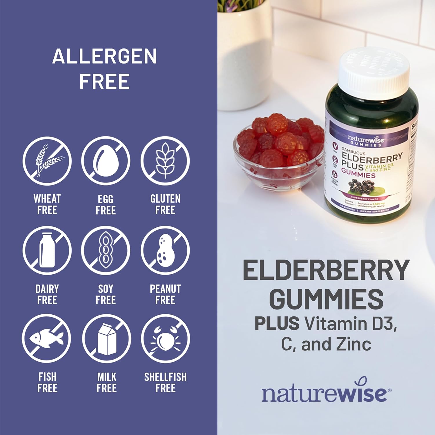 NO ARTIFICIAL COLORS OR FLAVORS: NatureWise Elderberry Gummies are deliciously elderberry flavored and pectin-based, without the use of gelatin or animal products. They are vegan and non-GMO, and do not contain wheat, gluten, dairy, eggs, soy, milk, tree nuts, peanuts, shellfish, artificial colors or flavors.
