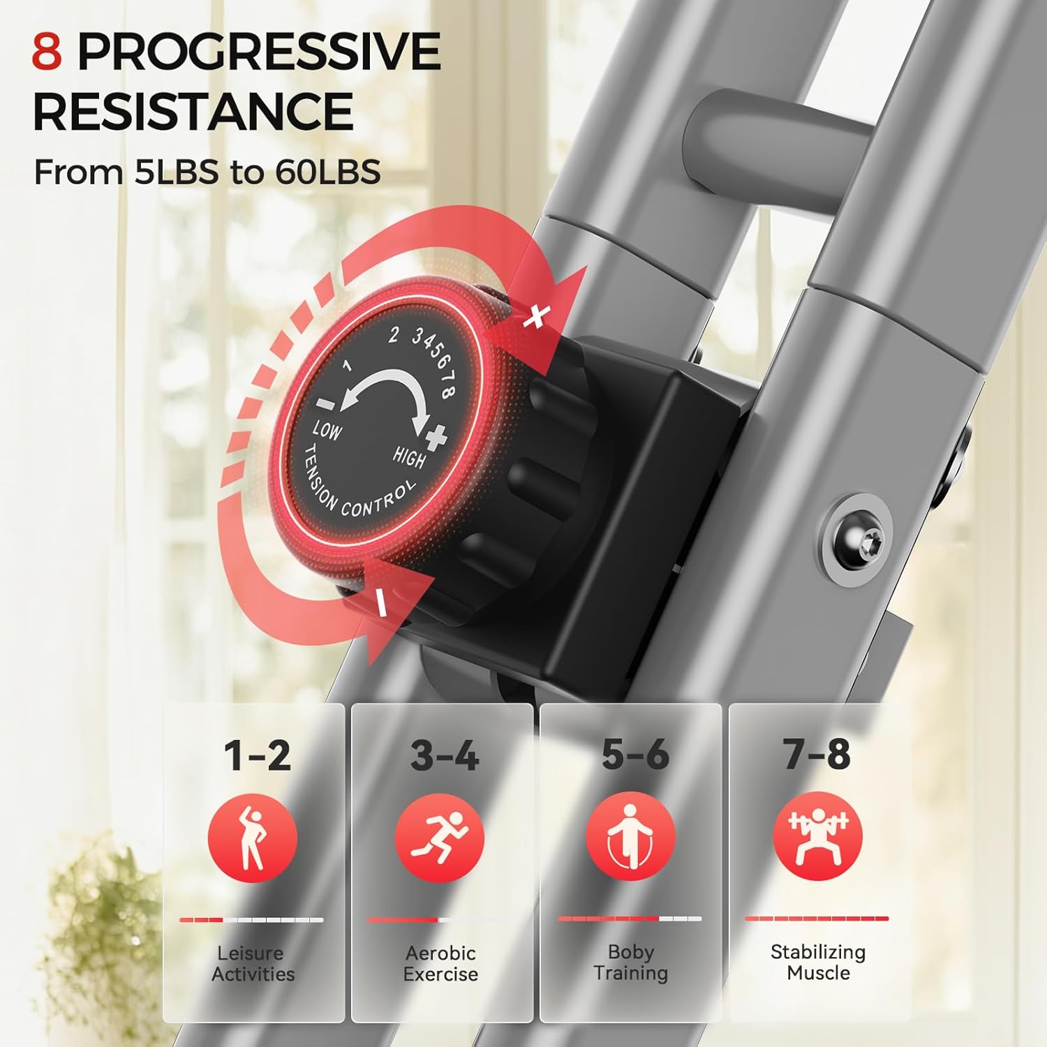 5 IN 1 DESIGN: Foldable exercise bike combines multiple exercise modes in one, supporting high intensity fat burning, low intensity stretching and strength training. Equipped with resistance bands for rowing and stretching. You can easily realize all-round workout goals at home.