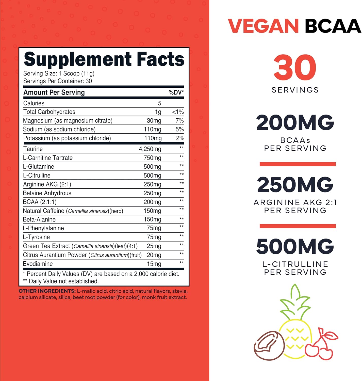 BCAAs | 5g (L-Leucine, L-Isoleucine, L-Valine, L-Glutamine, Taurine) 1.3g (Arginine, Beta-Alanine, PurCaf (organic caffeine – 100mg) Electrolyte Complex | 1g (sodium, potassium, magnesium)