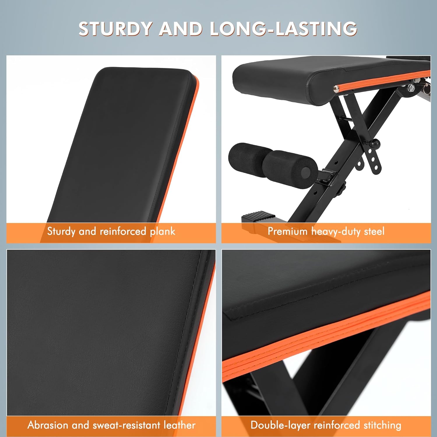 Built to Last: This weight bench is constructed using high-quality heavy-duty steel for a sturdy, long-lasting frame. The abrasion-resistant, sweat-proof leather offers a comfortable surface that stands up to intense workouts. Double-layer reinforced stitching adds an extra level of durability, ensuring the workout bench can withstand daily use without losing strength. These carefully selected materials make this adjustable weight bench a reliable and durable choice for any fitness enthusiast