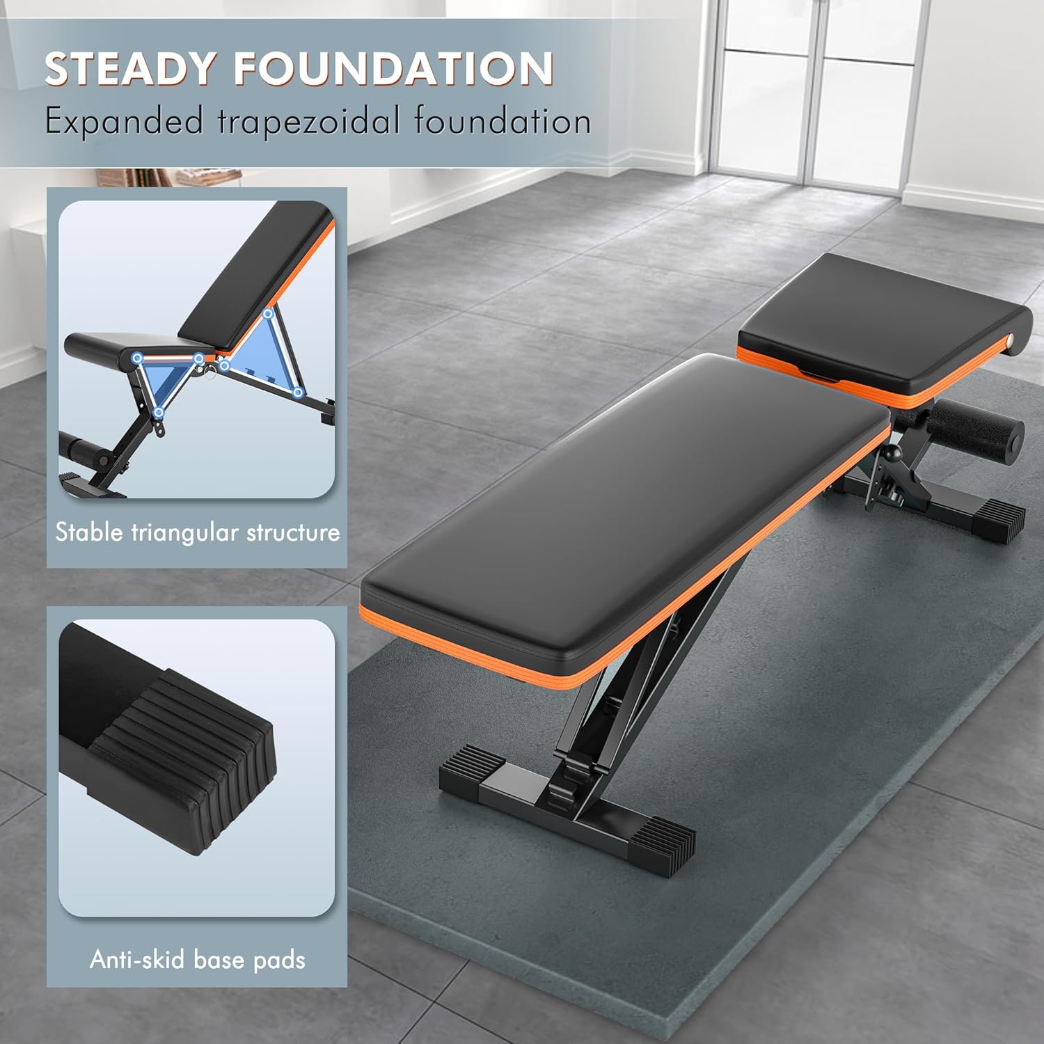 Stable Support: This weight bench features a sturdy triangular frame design and an anti-slip base pad, ensuring maximum stability during workouts. The solid structure prevents shifting or wobbling, providing you with reliable support whether you’re lifting heavy weights or performing bodyweight exercises. The anti-slip base further enhances safety, keeping the workout bench firmly in place while you focus on your training. This reliable adjustable weight bench ensures a safe and steady workout experience every time